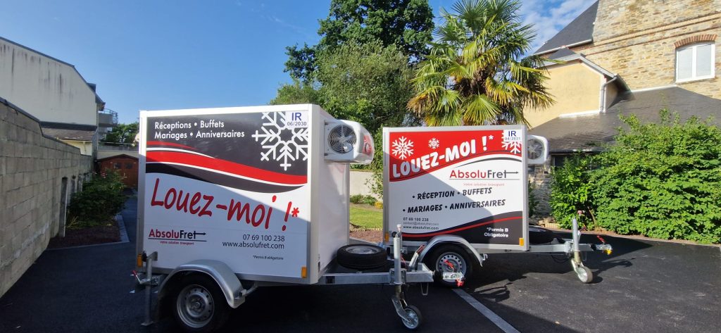 AbsoluFret loue une remorque frigorifique d’une capacité de 3 m3 avec étagères. Simple d’utilisation, elle se conduit avec le Permis B, l’alimentation se fait en la branchant sur secteur.